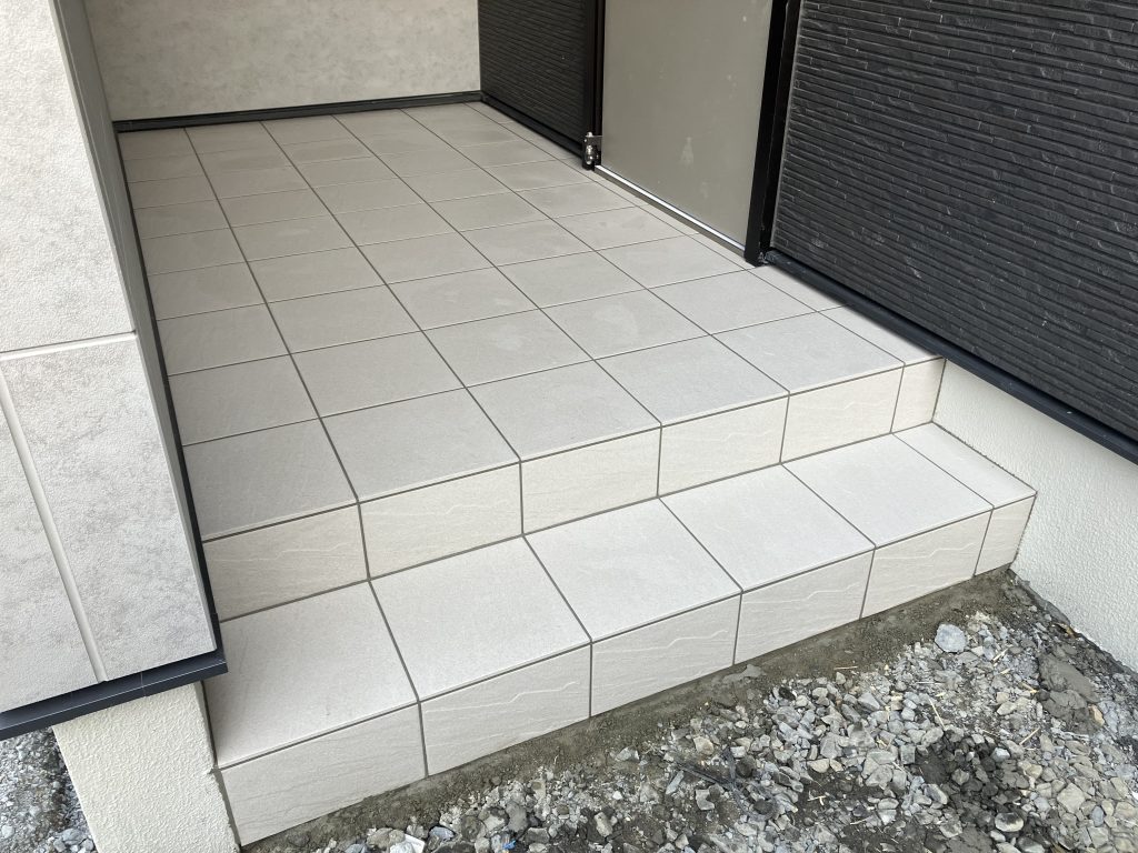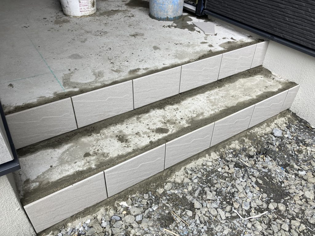 At KANNO TOGYO, when installing tiles on stairs or other surfaces that have both vertical and horizontal lines, we use a technique called "DANGOBARI," which involves laying tiles starting from the vertical lines. This technique is so named because the mortar is applied in large amounts on the tiles, like a dumpling.This construction method can only be carried out by skilled craftsmen.