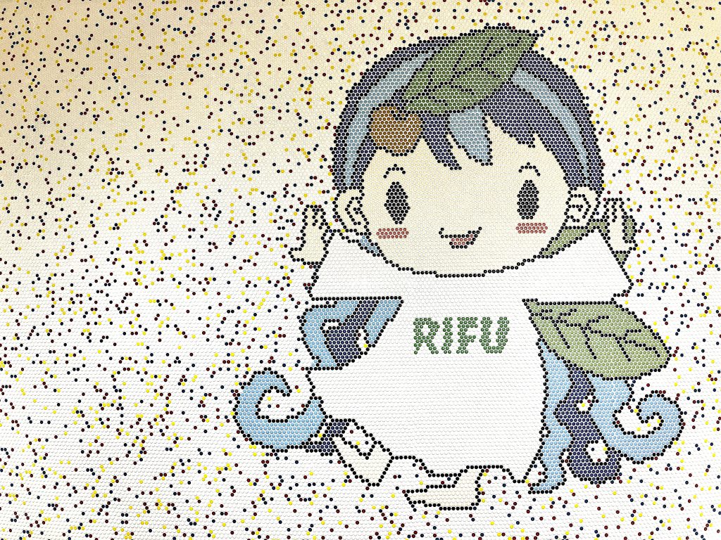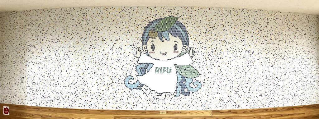 At KANNO TOGYO, we can do artistic tile installation. In the photo, we have drawn the official Rifu Town character "TOFU NO SATO NO YOUSEI Leaf chan" with mosaic tiles in the rest area of ​​the Rifu Town Central Children's Center "PEAKURU". Tiles have also been attached to the pillars in the center, giving the interior space a warm feeling.